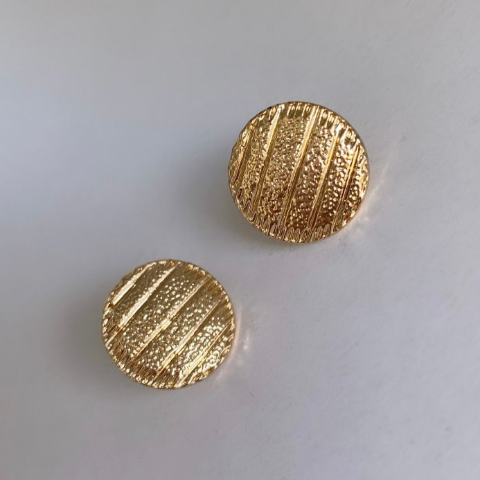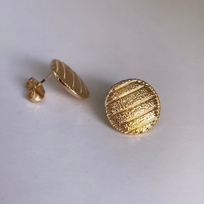 Aretes Botón que lucen como un botón real, con sutiles grabados. Joyería Fina de Oro Laminado 24k. Medidas de 1.4cm x 1mm.