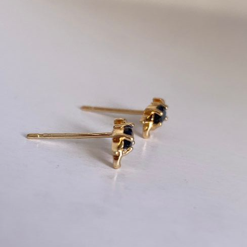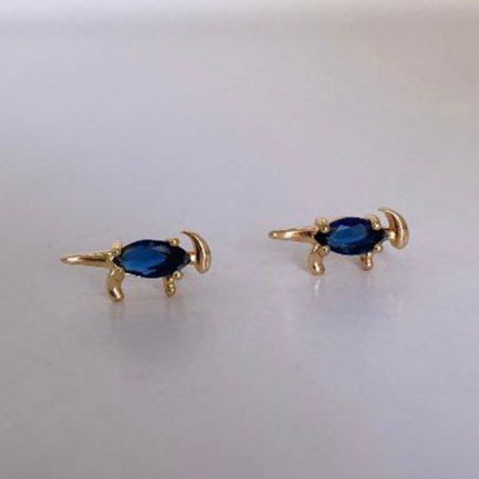 Aretes Dino Azul en forma de dinosaurio con zirconia ovalada azul marino. Joyería Fina de Oro Laminado 18k. Medidas 1cm x 4mm.