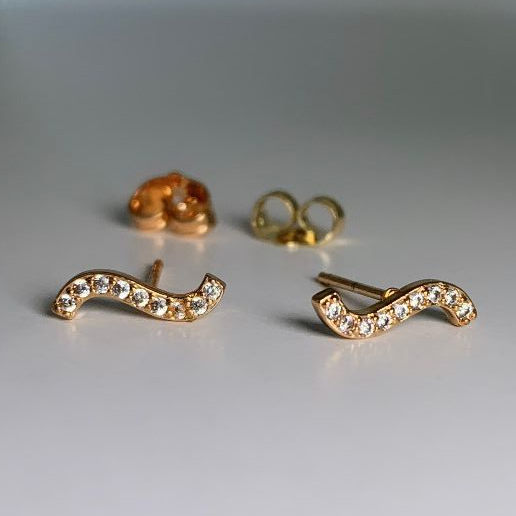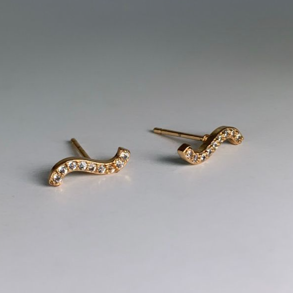 Aretes Sira en forma de S, zirconias blancas. Joyería Fina de Oro Laminado 18 k. Medidas 1.2cm x 1mm.