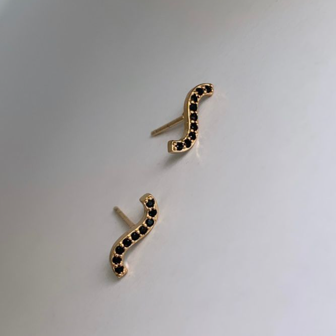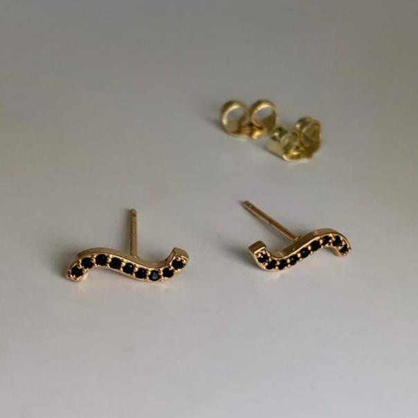 Aretes Sira en forma de S con zirconias negras. Joyería Fina de Oro Laminado 18 k. Medidas 1.2cm x 1mm.