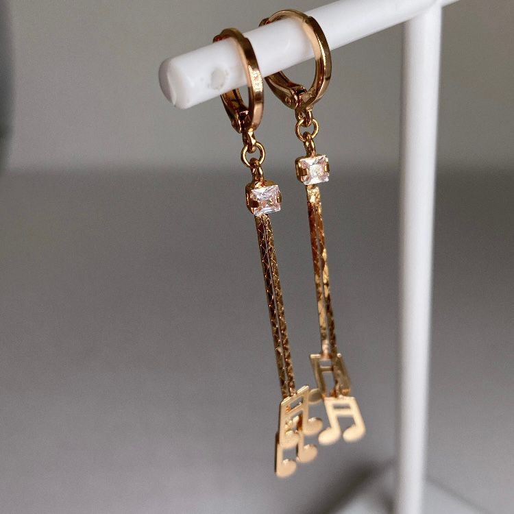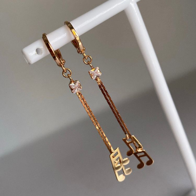 Arracada Nota Musical, con pequeña zirconia al inicio. Joyería Fina de Oro Laminado 24k. Oro Rosa Especial. Medida de arracada 1cm. Largo total 5.6cm.