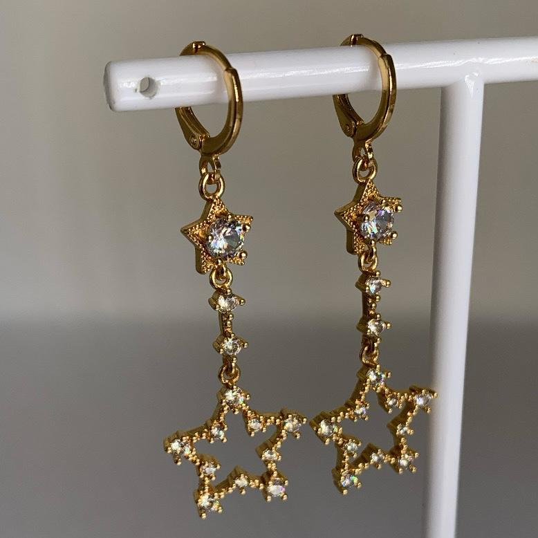 Arracadas White Star, con zirconias blancas. Joyería Fina de Oro Laminado 18k. Medidas arracada 1cm, largo total de 5.6cm, ancho de estrella 1.6cm.