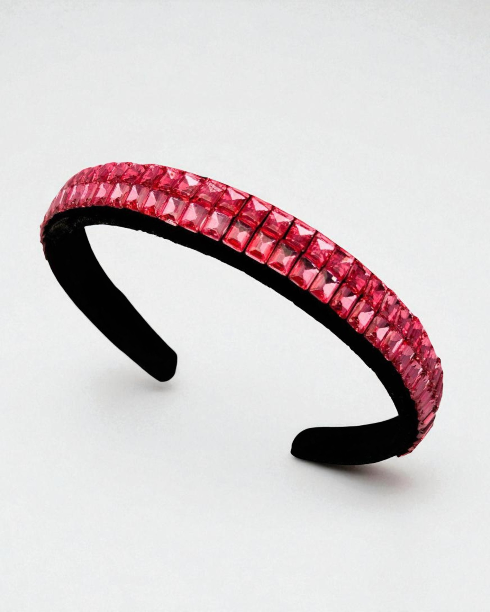 Diadema Paola en color rosa barbie, delgada con pedrería a cuadros. Ideal para el uso diario.