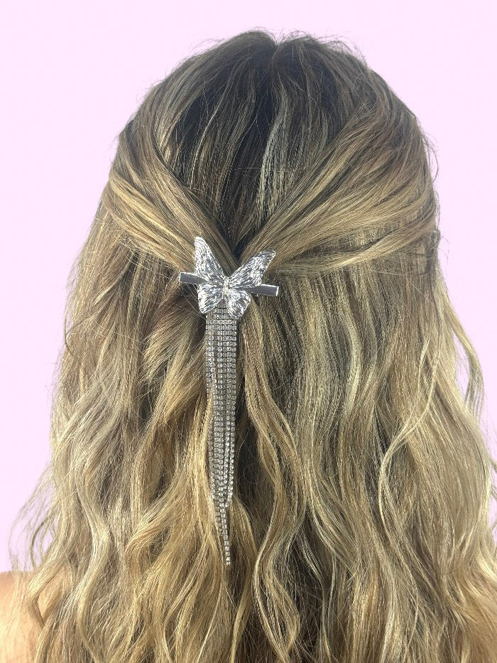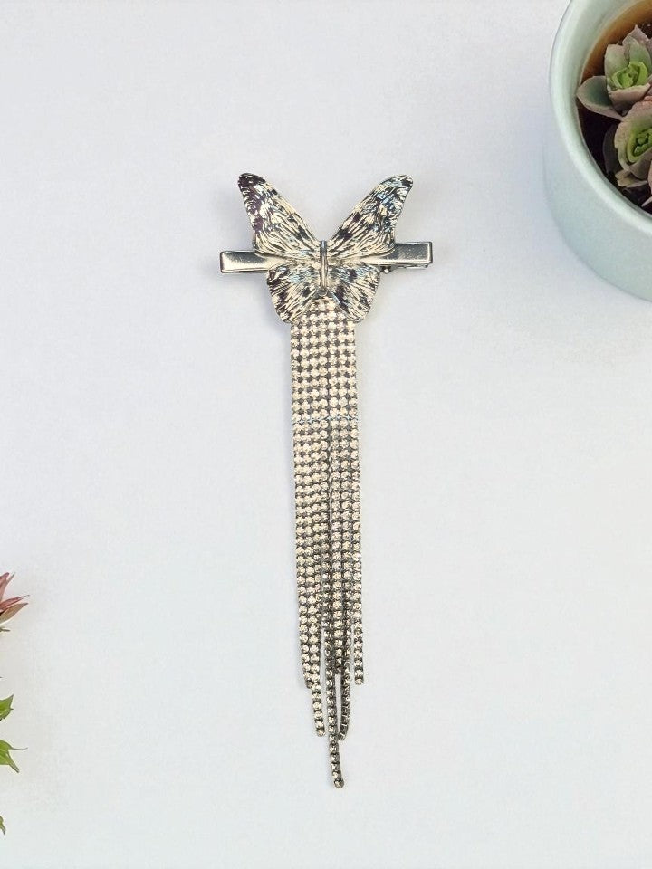 Broche Mariposa Plateada, con una cascada de cristales blancos. Largo de 16.5cm