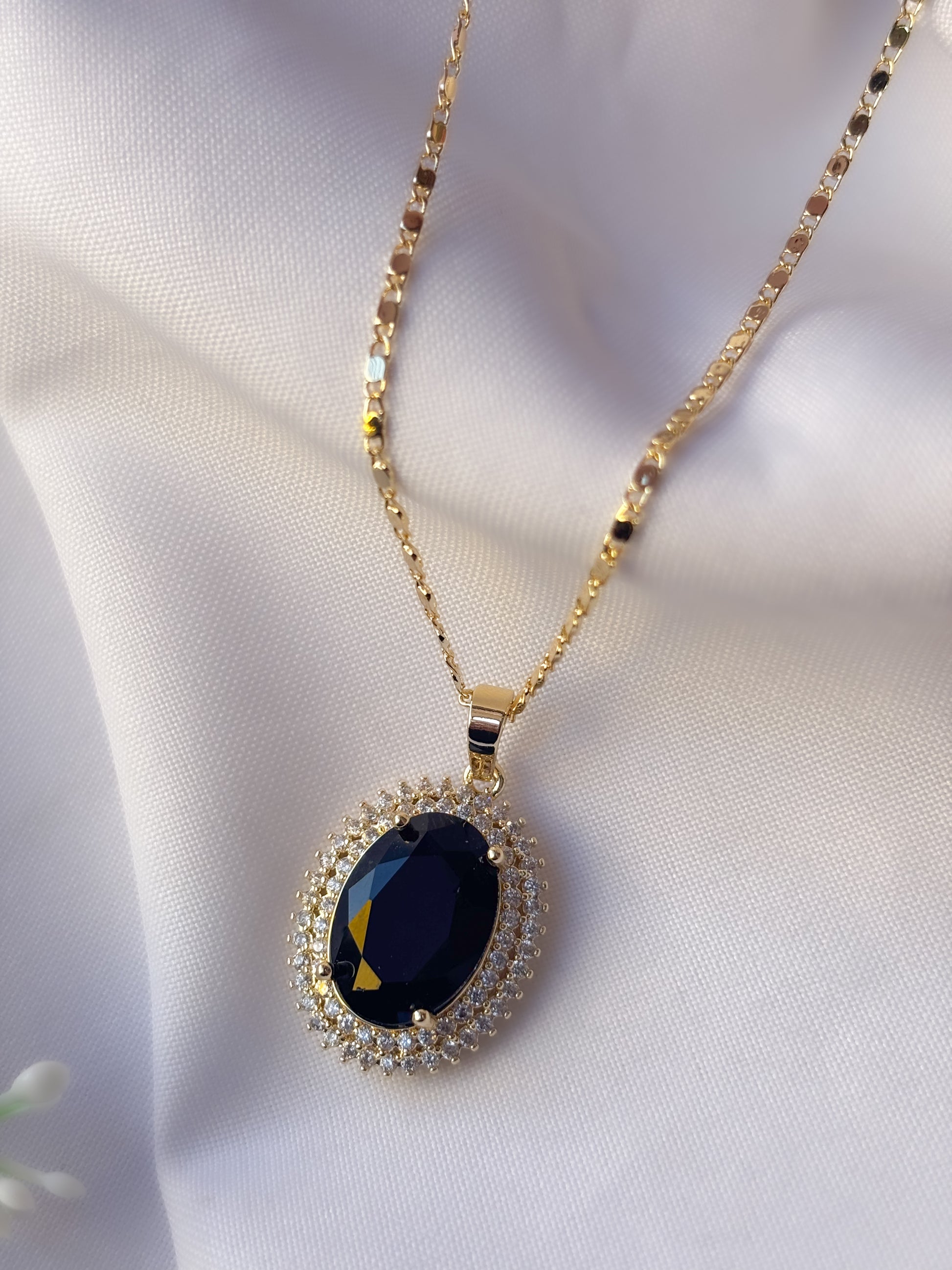 Collar Con Dije Gema Color Negro Oro Laminado 24K
