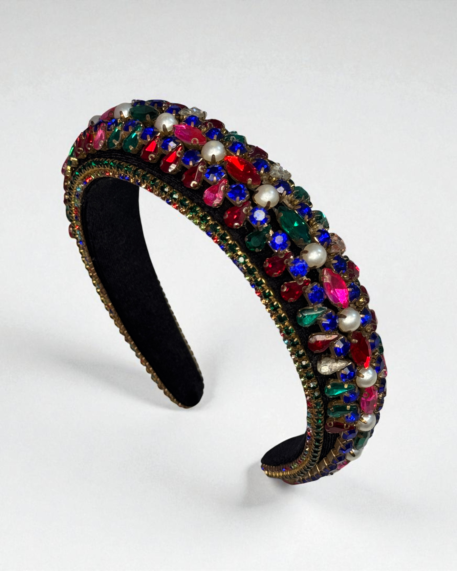 Diadema Ofelia en multicolor, semi alta y ancha con cristalería de extremo a extremo, comoda y ajustable.