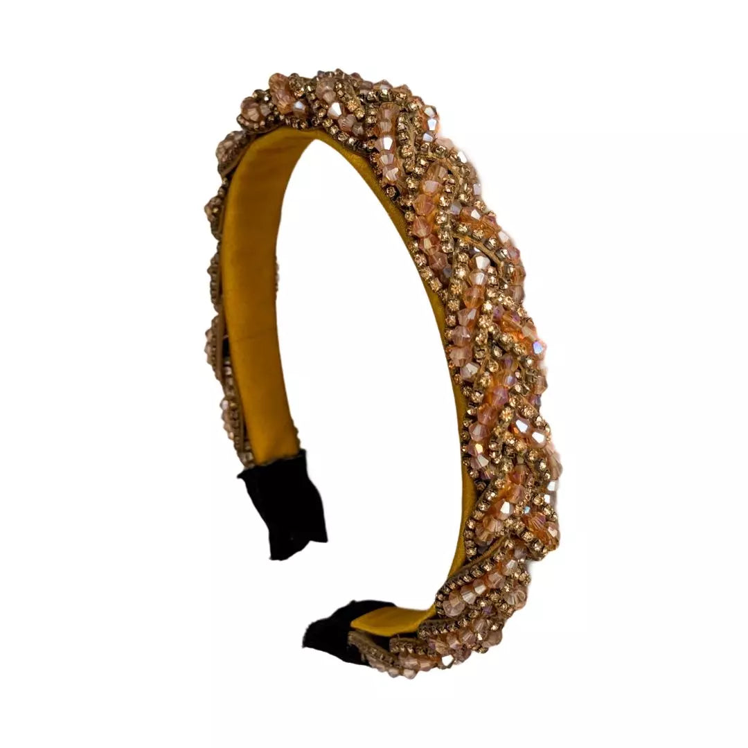 Diadema Anna en color café claro, diseño trenzado entre cristalería y pedrería.