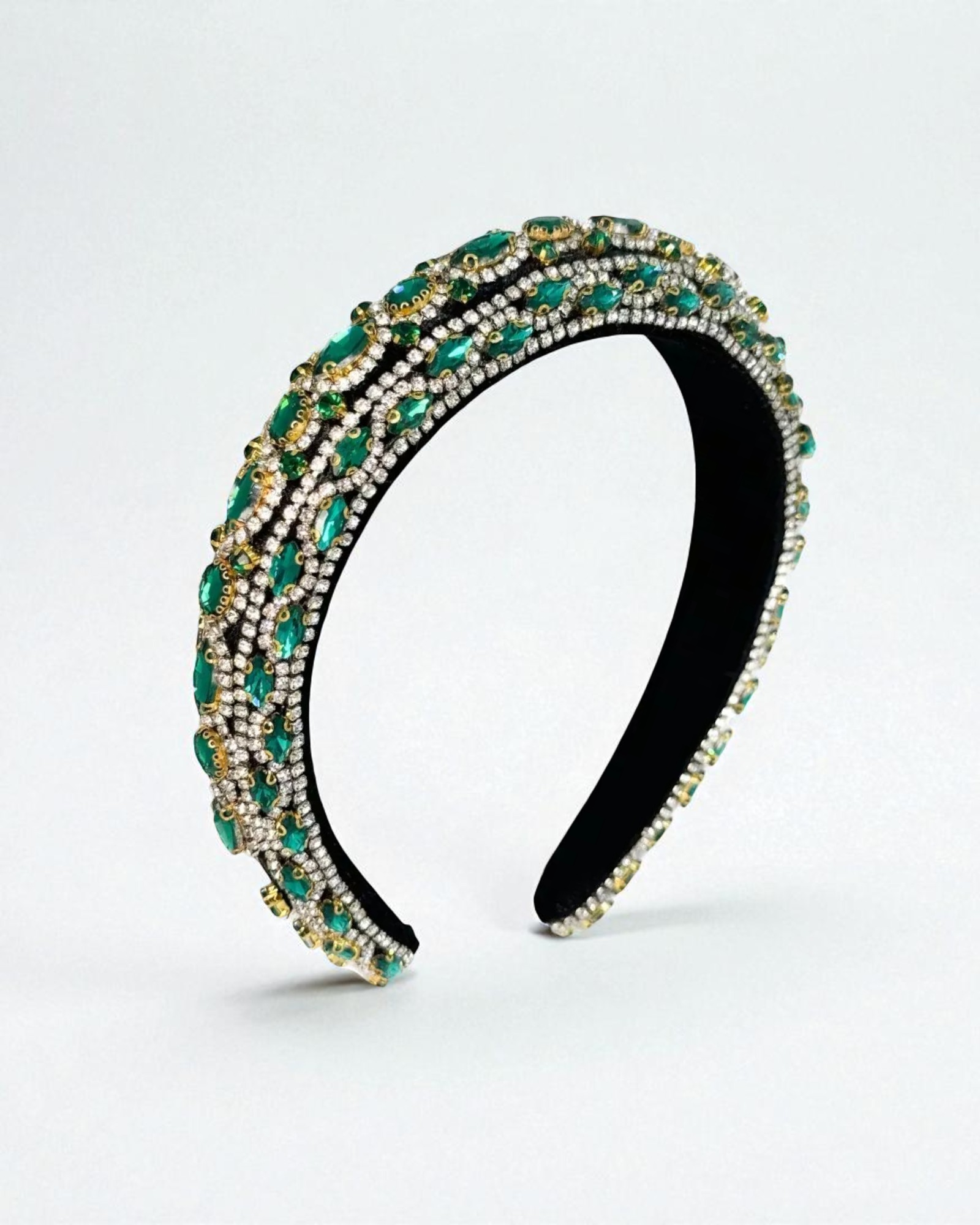 Diadema Charlotte en color verde, alta con cristalería en patrón lineal, amigable con todo tu closet.