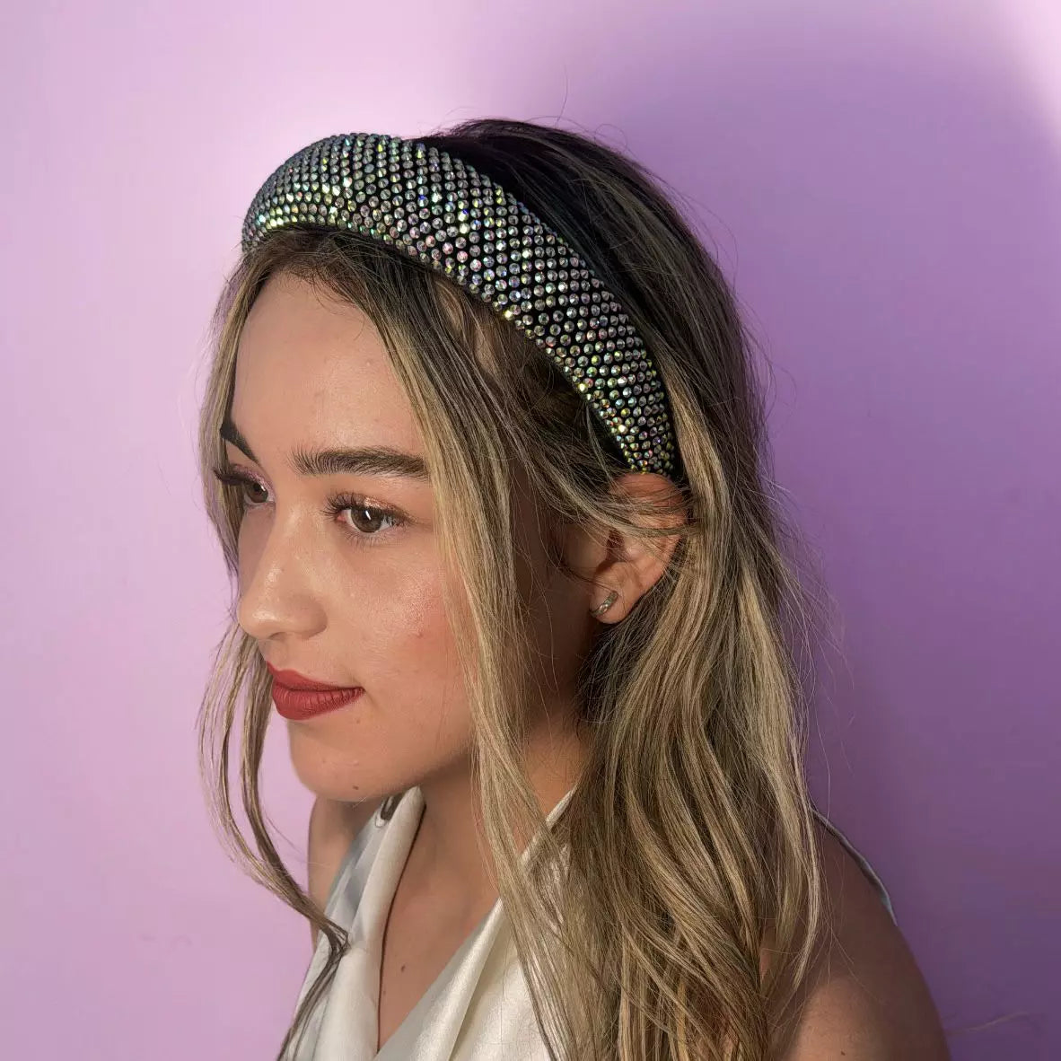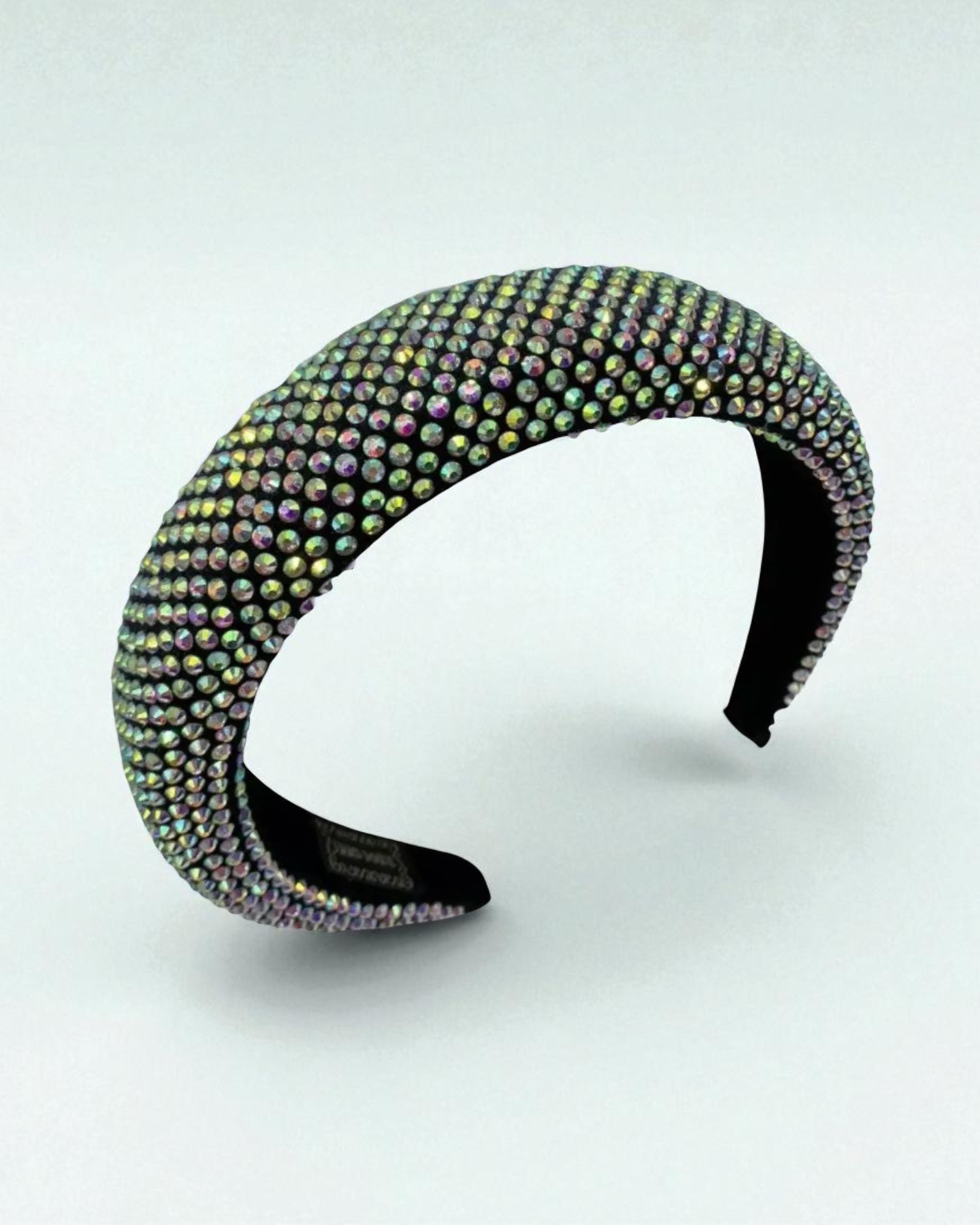 Diadema Galaxia en colorimetría tornasol, ancha y alta con pedrería, diseño ligero y cómodo.