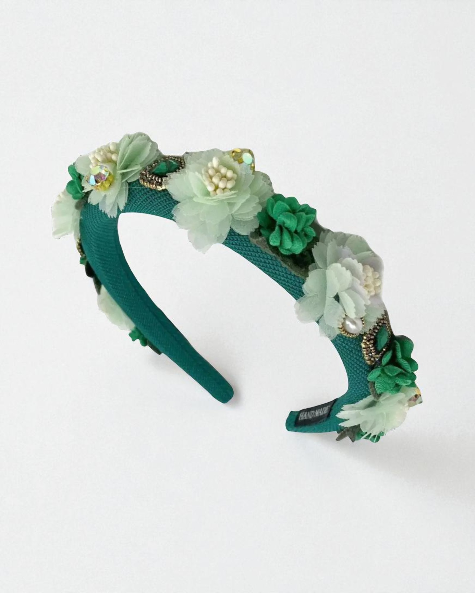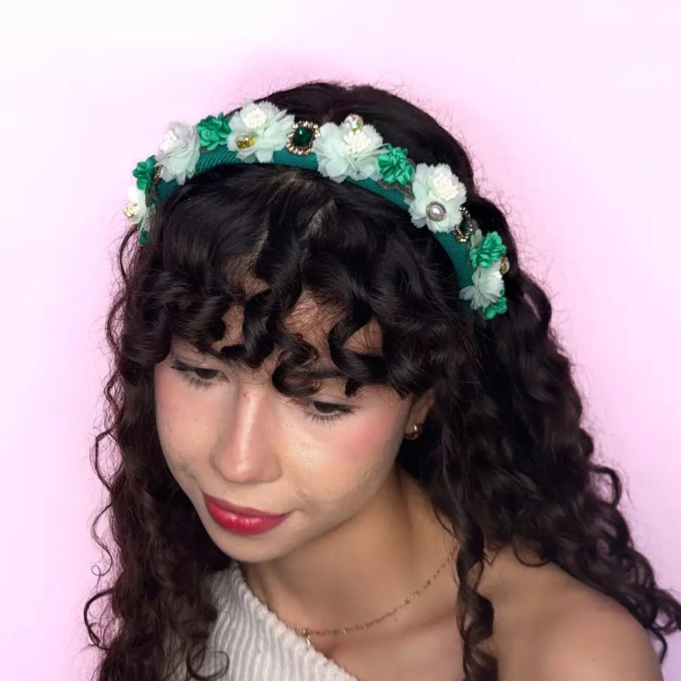 Diadema Gardenia en color verde, con un diseño bastante tierno asimilando una corona de adornos florales y pequeños cristales.