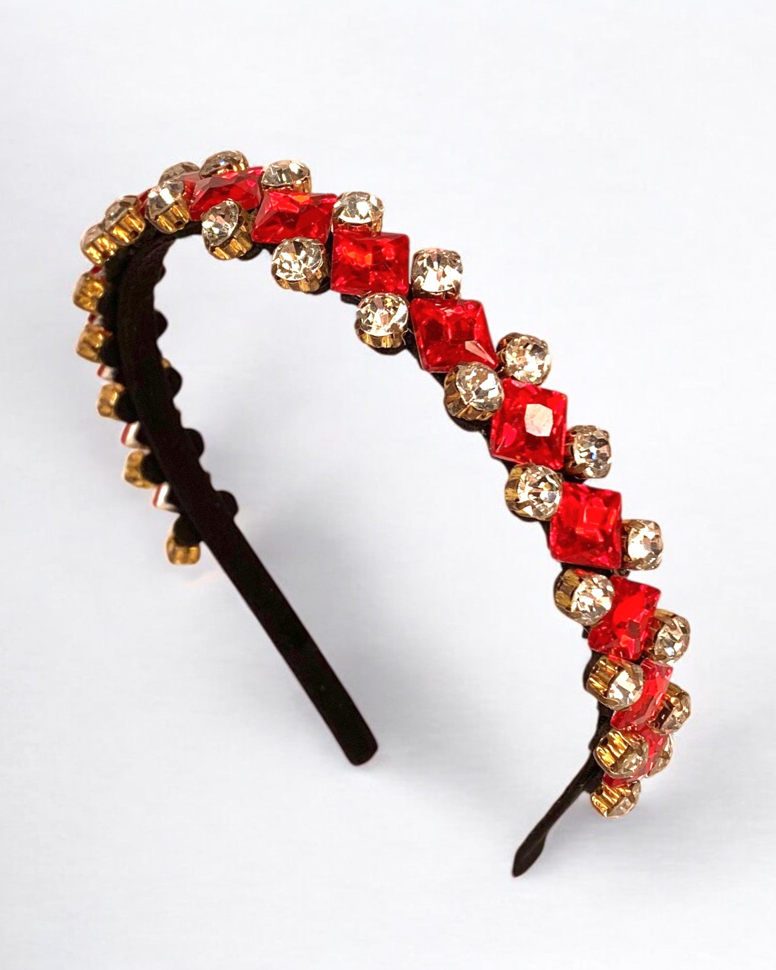 Diadema Heidi en color rojo, delgada con piedra rombo y cristales blancos en cada comisura, su base le permite lucir como una tiara.