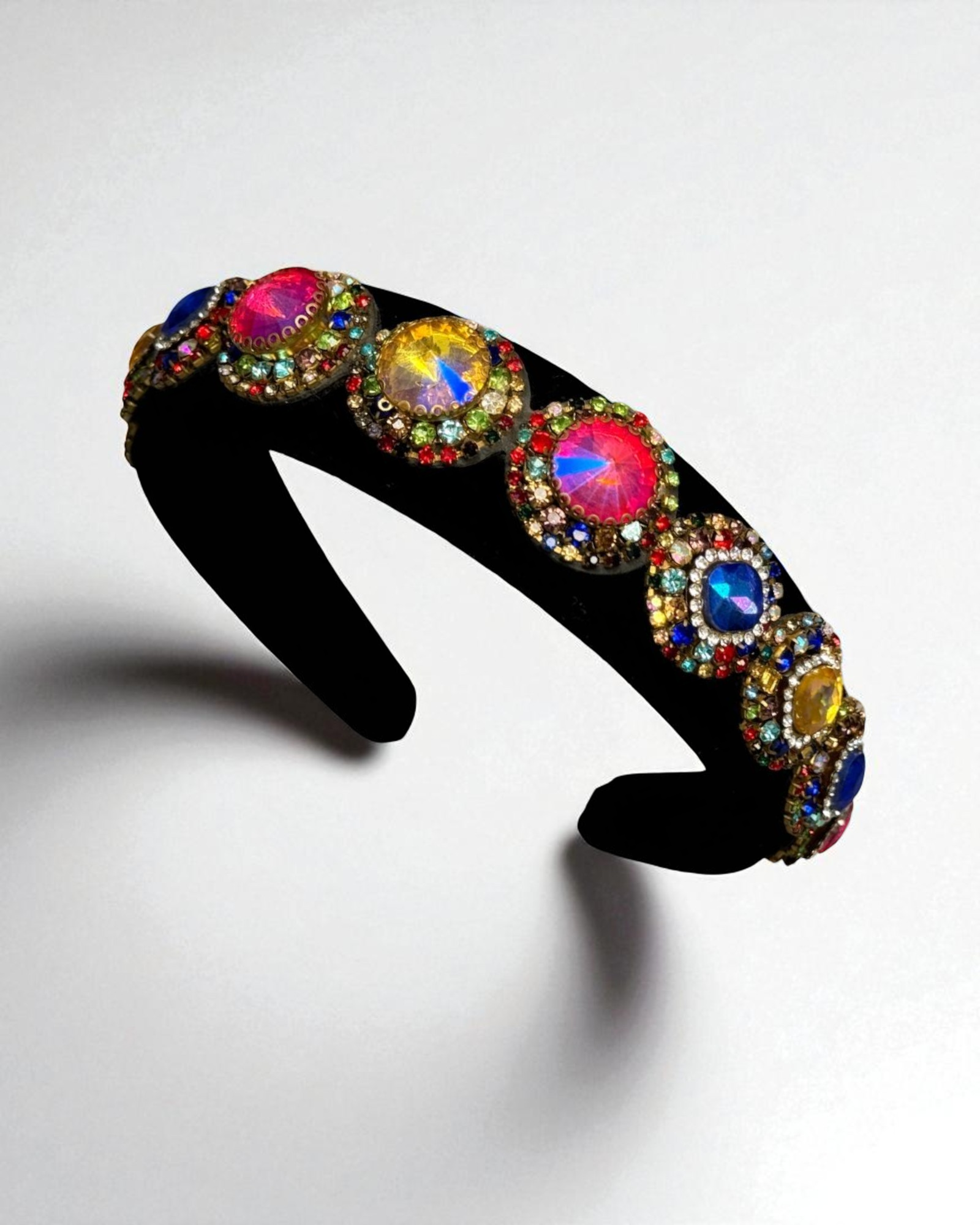 Diadema Matilda en multicolor + negro, plana y ancha con cristalería centrada y lineal.