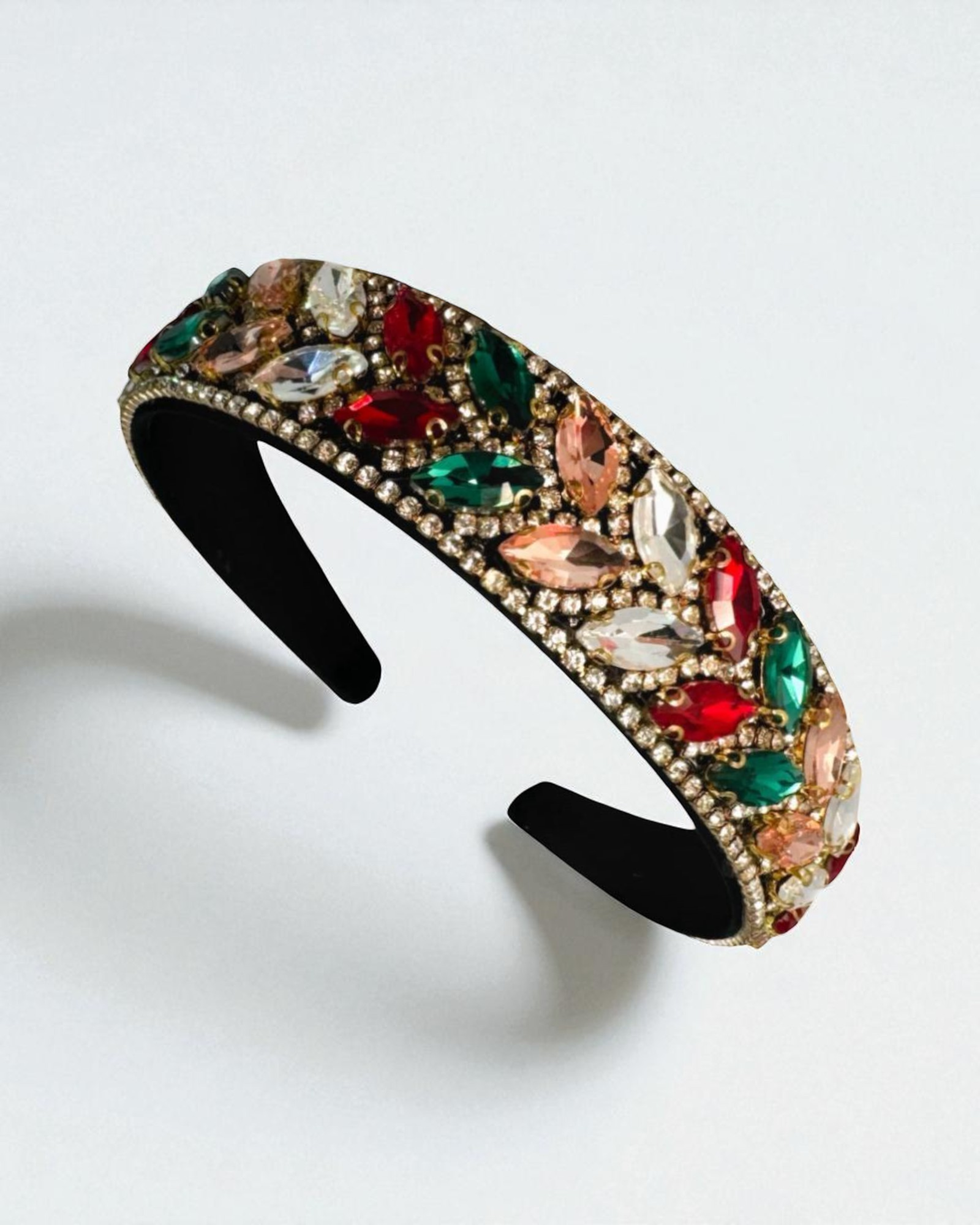 Diadema Olivia en multicolor, plana con cristales que asimilan pétalos u hojas, detallada con pequeños cristales blancos que acentúan su belleza.