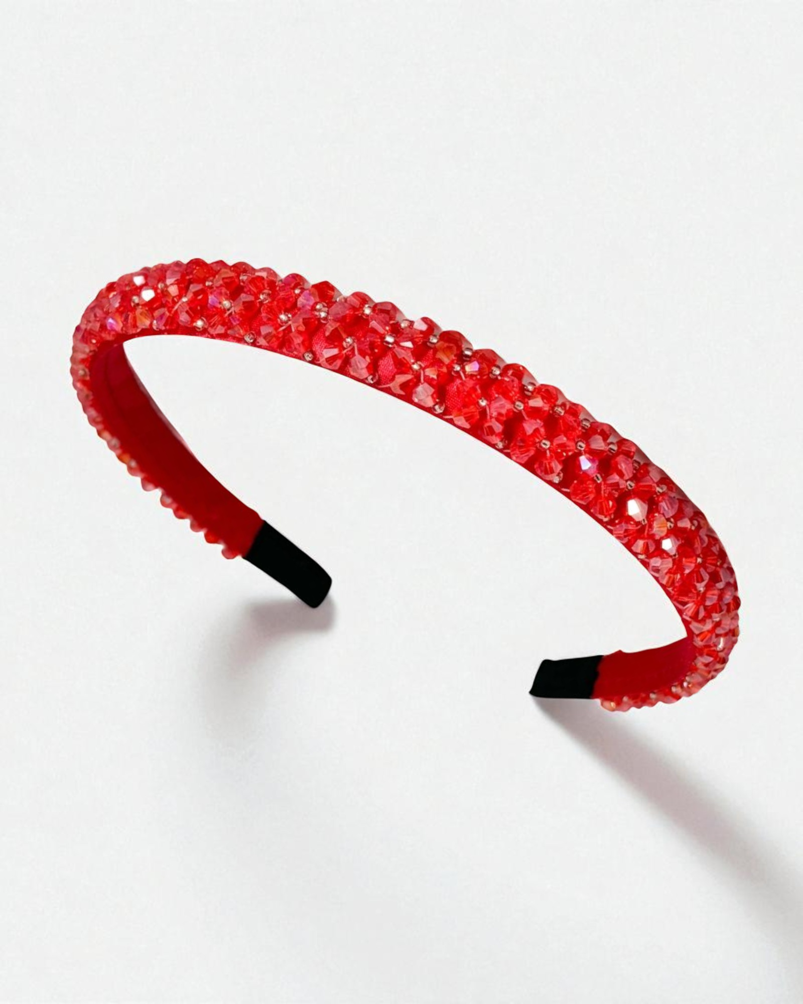 Diadema Tejida Sencilla en color rojo, con cuentas rombo y chaquiras, un modelo básico pero sin duda esencial.