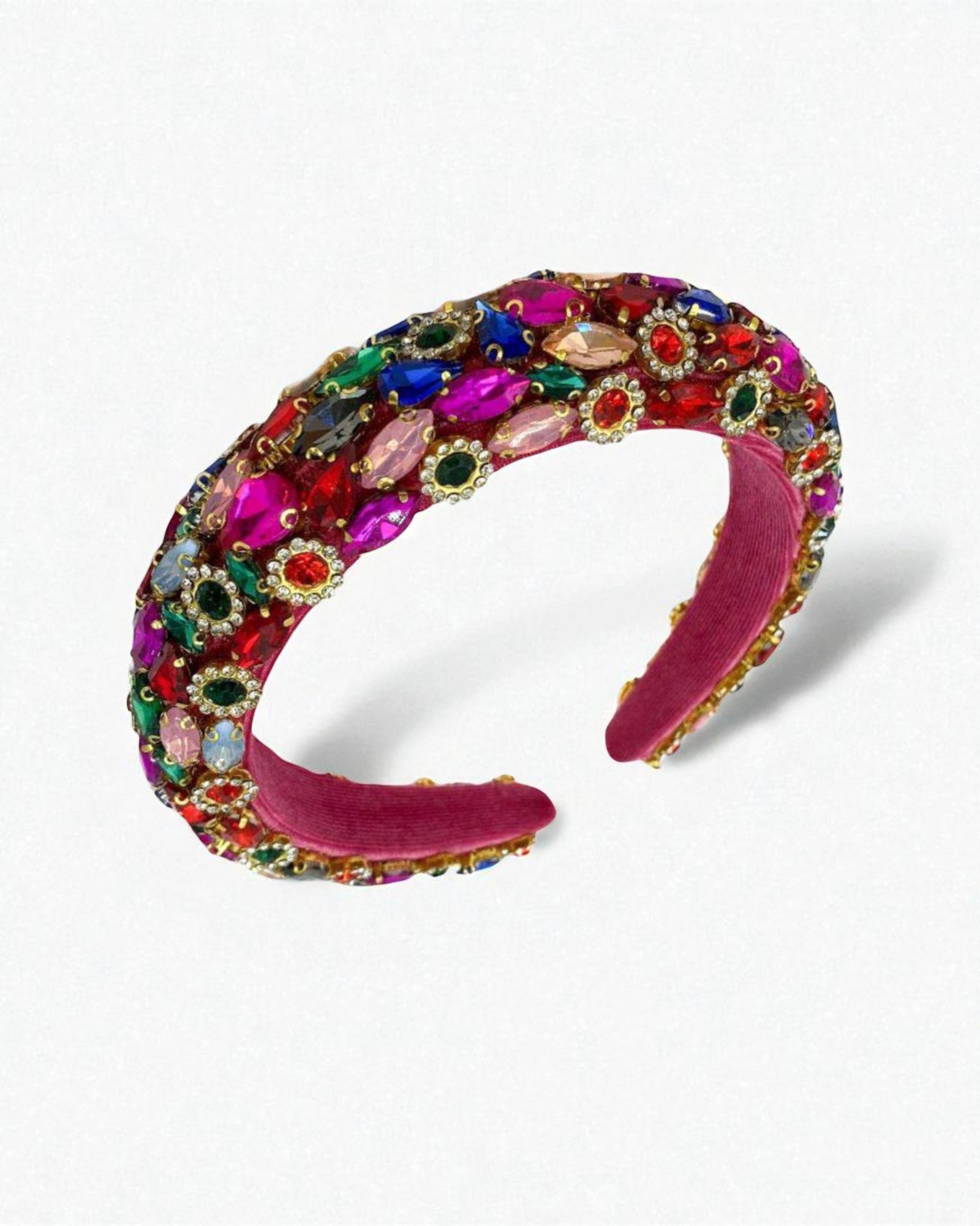 Diadema Tirsa en multicolor, alta con cristalería grande de extremo a extremo, adornada de pequeños cristales en forma de flores, irradiando elegancia y luz.