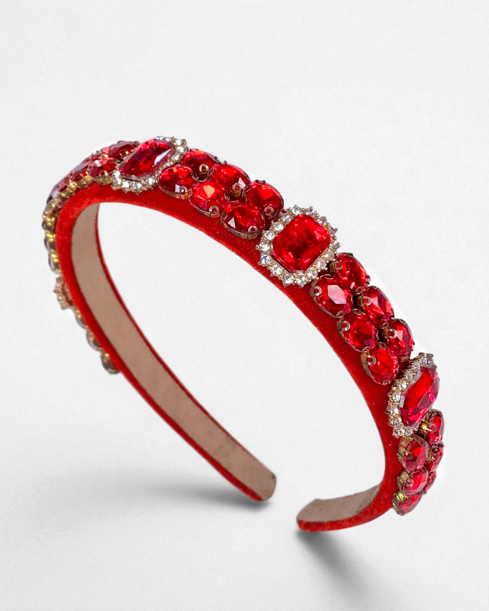 Diadema Kendall en color rojo, delgada con adornos en pequeños cristales blancos que marcan totalmente la diferencia.