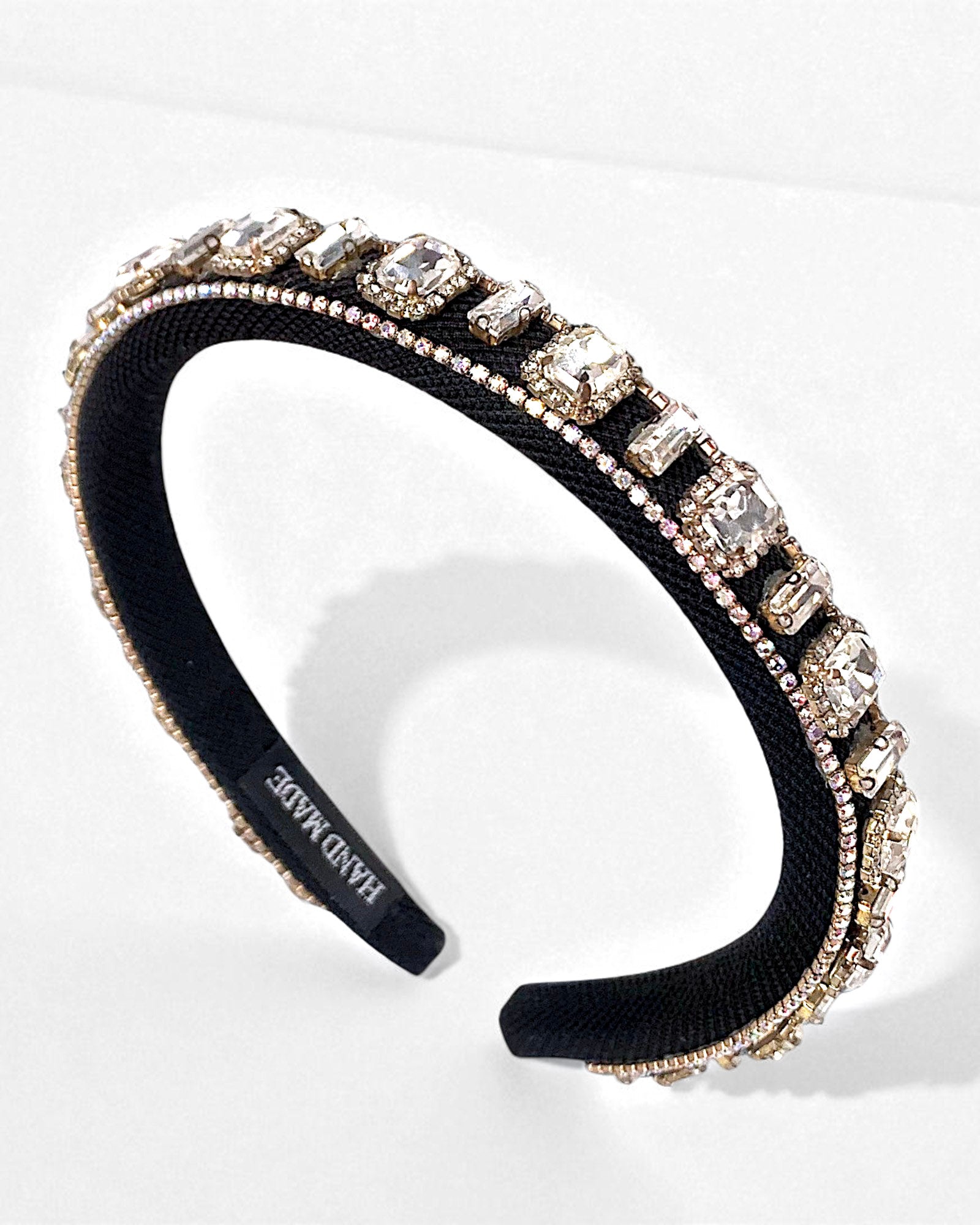 Diadema Kristen en color negro con cristales blancos y tornasol pequeños.
