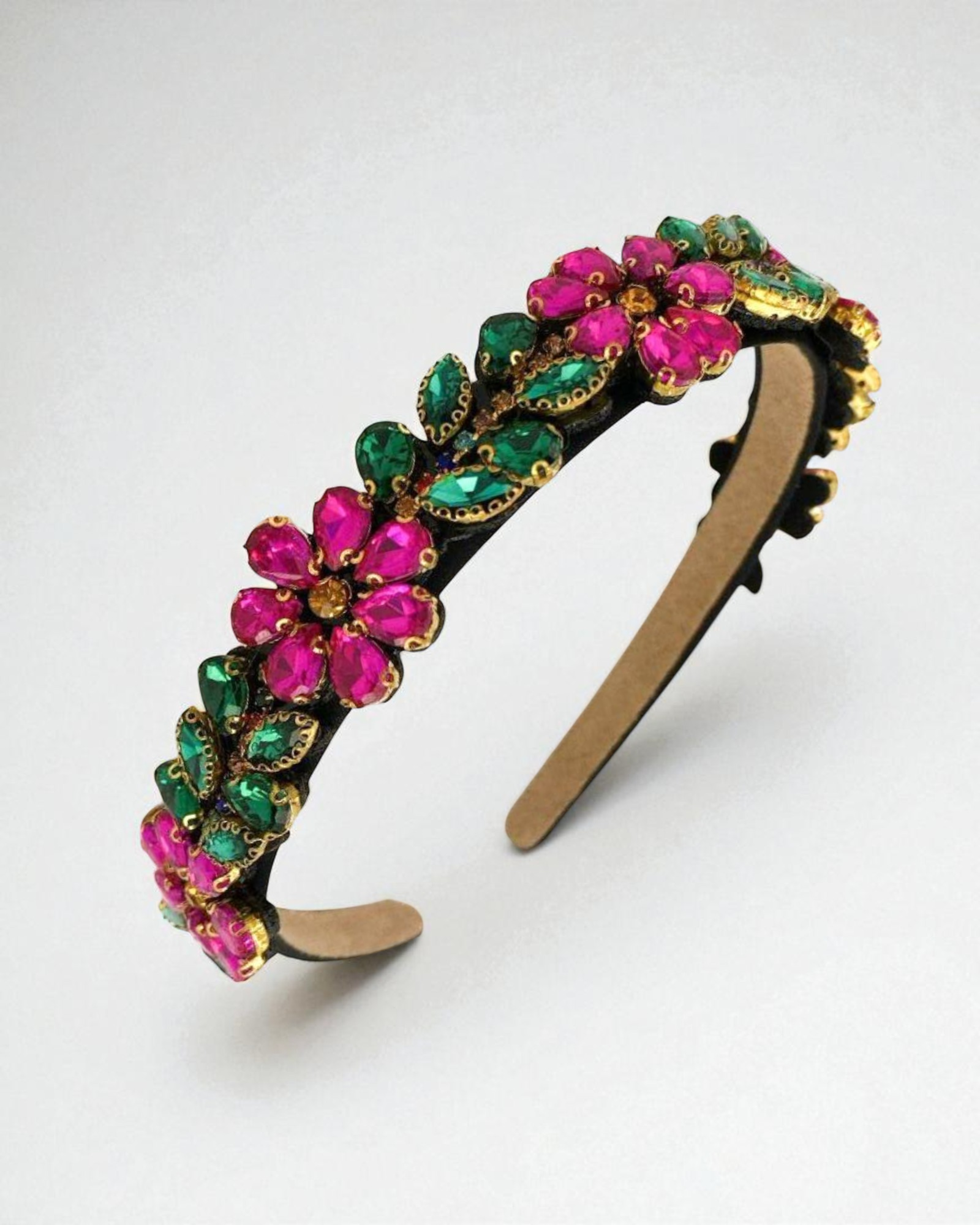 Diadema Lily en color fucsia + verde, delgada con cristalería formando una guía floral.