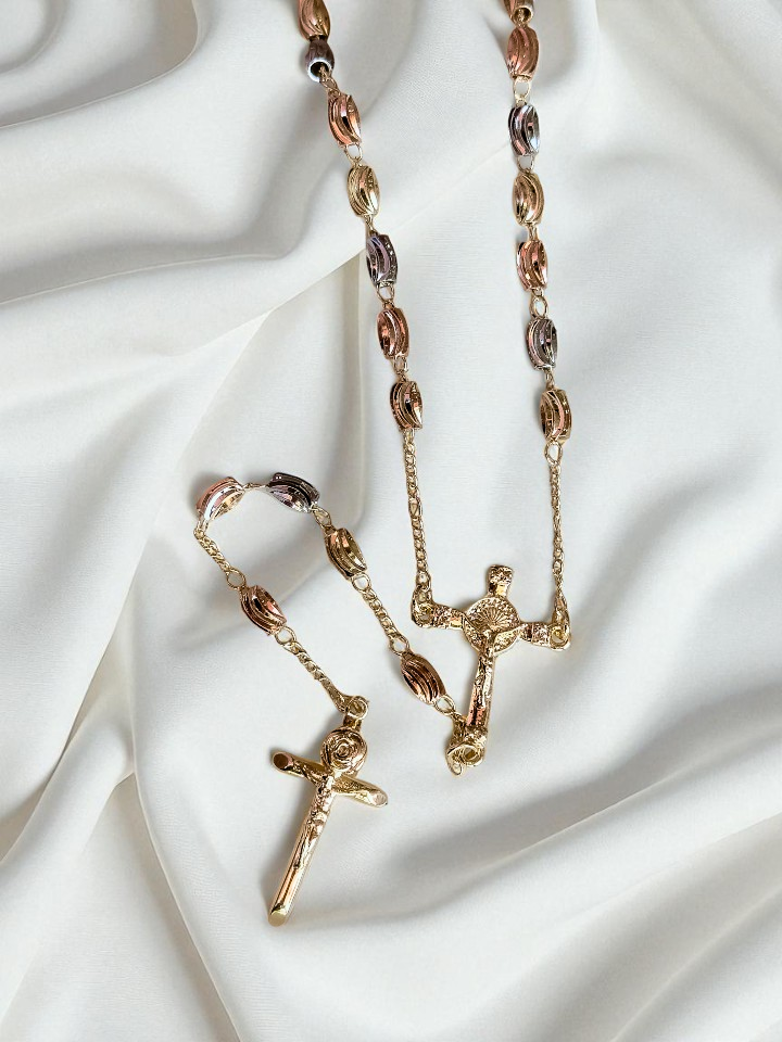 Rosario de cuentas grabadas en forma de arroz, con baño de los 3 oros: oro amarillo, blanco y rosado. Con 2 cruces de Cristo delicadamente grabadas.