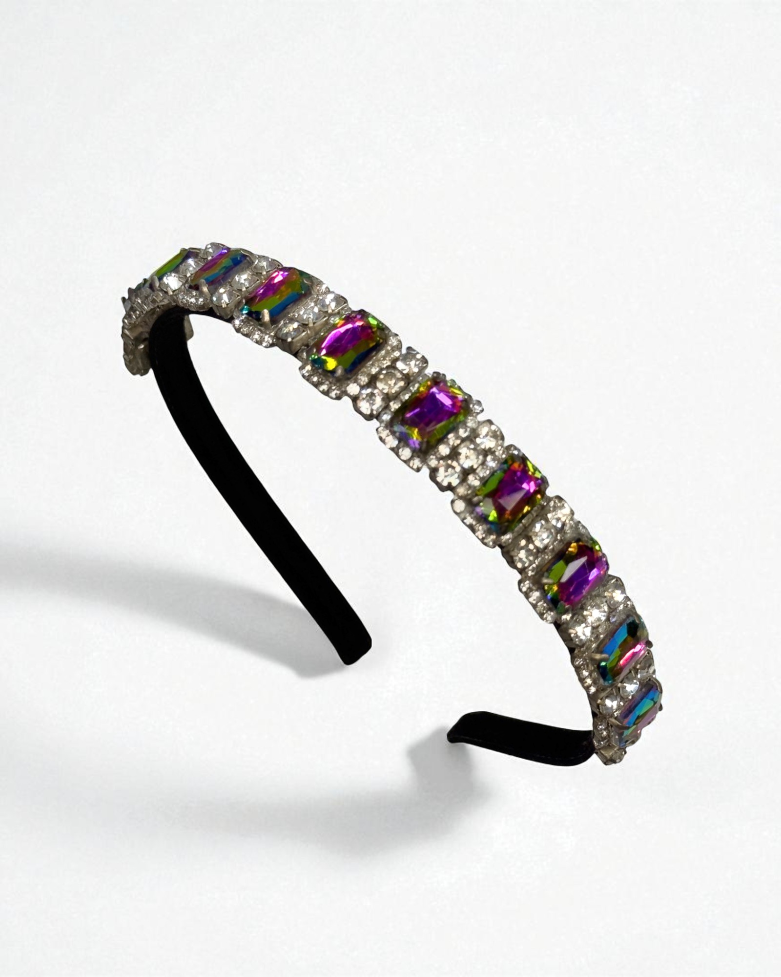 Diadema Nailea con colorimetría tornasol verde como una aurora boreal. Acompañada de cristalería blanca. Su base le permite lucir como una tiara, sutil y elegante.